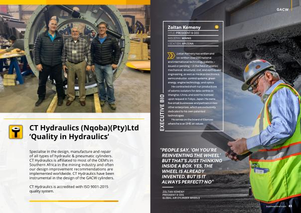Specialise in the design , manufacture and repair of all types of hydraulic & pneumatic cylinders . CT Hydraulics is affiliated to most of the OEM ’ s in Southern Africa in the mining industry and often our design improvement recommendations are implemented worldwide . CT Hydraulics have been instrumental in the design of the GACW cylinders .