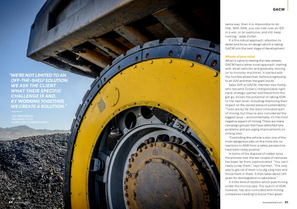 Sales SVP at GACW , Harmen Van Kamp , who became Zoltan ’ s indispensable right hand , strategic partner and friend from the get go , knows the potential of taking ASW to the next level , including improving their impact on the sacred arena of sustainability : “ Tyres are by far the least innovated part of mining , but they ’ re also considered the biggest issue – environmentally , it ' s the most negative aspect of mining . There are many campaign groups that have identified tyre problems and are urging improvements on mining sites .