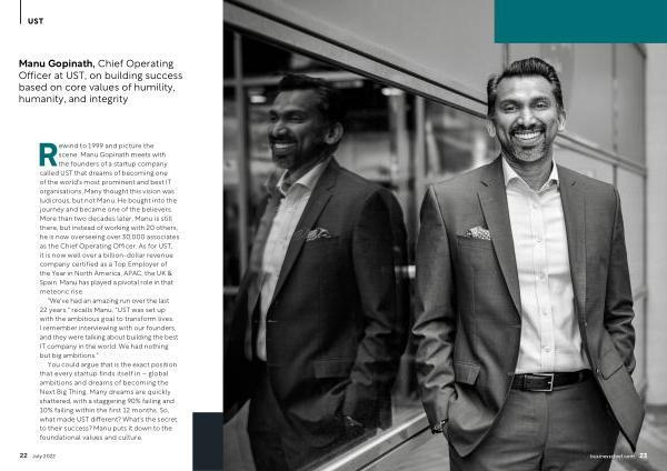Rewind to 1999 and picture the scene . Manu Gopinath meets with the founders of a startup company called UST that dreams of becoming one of the world ' s most prominent and best IT organisations . Many thought this vision was ludicrous , but not Manu . He bought into the journey and became one of the believers . More than two decades later , Manu is still there , but instead of working with 20 others , he is now overseeing over 30,000 associates as the Chief Operating Officer . As for UST , it is now well over a billion-dollar revenue company certified as a Top Employer of the Year in North America , APAC , the UK & Spain . Manu has played a pivotal role in that meteoric rise .