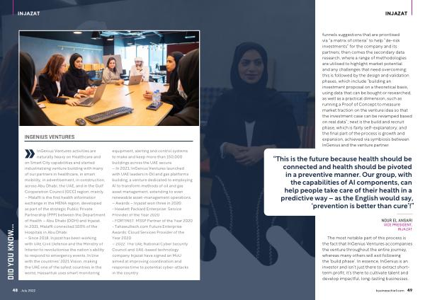 InGenius Ventures activities are naturally heavy on Healthcare and on Smart City capabilities and started industrialising venture building with many of our partners in healthcare , in smart mobility , in advertisement , in construction , across Abu Dhabi , the UAE , and in the Gulf Cooperation Council ( GCC ) region , mainly . – Malaffi is the first health information exchange in the MENA region , developed as part of the strategic Public Private Partnership ( PPP ) between the Department of Health – Abu Dhabi ( DOH ) and Injazat . In 2021 , Malaffi connected 100 % of the Hospitals in Abu Dhabi – Since 2018 , Injazat has been working with UAE Civil Defense and the Ministry of Interior to revolutionise the nation ’ s ability to respond to emergency events . In line with the countries ' 2021 Vision , making the UAE one of the safest countries in the world , Hassantuk uses smart monitoring equipment , alerting and control systems to make and keep more than 150,000 buildings across the UAE secure . – In 2021 , InGenius Ventures launched with UAE leaders in Oil and gas platforms building , a venture dedicated to employing AI to transform methods of oil and gas asset management , extending to even renewable asset-management operations . – Awards – Injazat won three in 2020 : - Hewlett Packard Enterprise : Service Provider of the Year 2020 - FORTINET : MSSP Partner of the Year 2020 - Tahawultech . com Future Enterprise Awards : Cloud Services Provider of the Year 2020 – 2022 : The UAE National Cyber Security Council and UAE-based technology company Injazat have signed an MoU aimed at improving coordination and response time to potential cyber-attacks in the country .