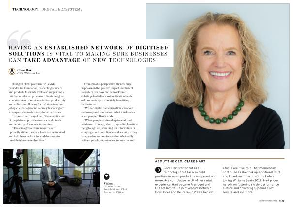 Chief Executive role . That momentum continued as she took up additional CEO and board member positions , before joining Williams Lea in 2019 . Hart prides herself on fostering a high-performance culture and delivering superior client service and solutions . businesschief . com 109