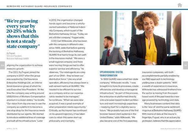 The CEO , Sy Foguel , joined the company in 2007 when the group was acquired by Clal Insurance Enterprise Holdings Ltd ., an international insurance group of which he was Executive Vice President . “ At the time the company was writing around US $ 200mn of Workers Compensation premium in a dozen states ,” he recalls . “ Our vision from day one was to use the company as a platform to become a one stop shop for the insurance needs distributed by our agents . We started to introduce additional lines of coverage and built all the infrastructure .” Later in 2012 , the organization changed hands again and became a whollyowned subsidiary of National Indemnity Company , which is part of the Berkshire Hathaway Group . “ Today , we are a $ 1.6bn company ,” Foguel adds .