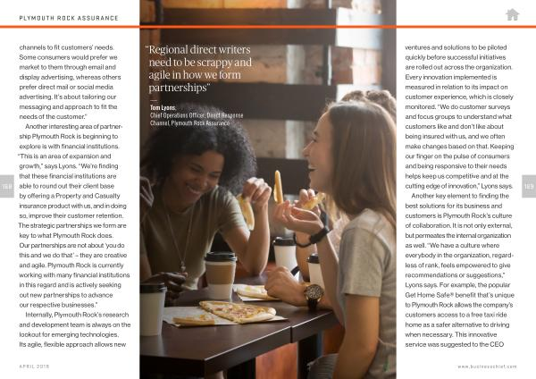 Another key element to finding the best solutions for its business and customers is Plymouth Rock ’ s culture of collaboration . It is not only external , but permeates the internal organization as well . “ We have a culture where everybody in the organization , regardless of rank , feels empowered to give recommendations or suggestions ,” Lyons says . For example , the popular Get Home Safe ® benefit that ’ s unique to Plymouth Rock allows the company ’ s customers access to a free taxi ride home as a safer alternative to driving when necessary . This innovative service was suggested to the CEO