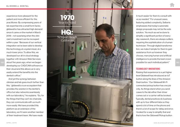182 experience more pleasant for the patient and more efficient for the practitioner . By compressing years of lab expertise into a small form factor , glidewell . io has attracted high demand since it came on the market in March 2018 – not surprising when the clinician ’ s investment can be recouped within a year . “ Because of our vertical integration we ’ ve been able to develop this technology at a system level , at a much lower price . To allow this , we developed our all-in cloud strategy together with Amazon Web Services about five years ago , when we began developing our CAD / CAM software on their cloud and this allows us to very easily extend the benefits into the dentist ’ s office .”
