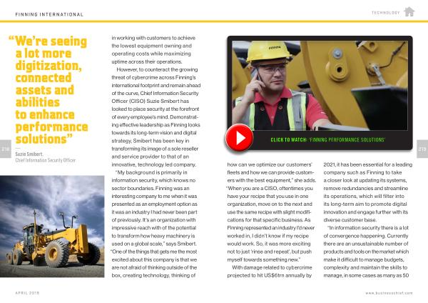 However , to counteract the growing threat of cybercrime across Finning ’ s international footprint and remain ahead of the curve , Chief Information Security Officer ( CISO ) Suzie Smibert has looked to place security at the forefront of every employee ’ s mind . Demonstrating effective leadership as Finning looks towards its long-term vision and digital strategy , Smibert has been key in transforming its image of a sole reseller and service provider to that of an innovative , technology led company .