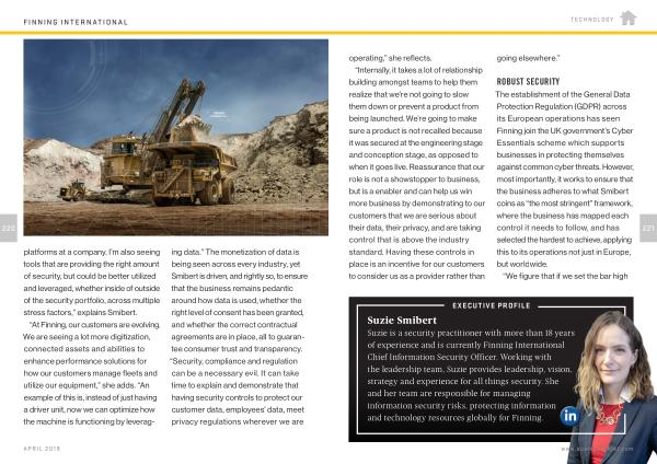 “ At Finning , our customers are evolving . We are seeing a lot more digitization , connected assets and abilities to enhance performance solutions for how our customers manage fleets and utilize our equipment ,” she adds . “ An example of this is , instead of just having a driver unit , now we can optimize how the machine is functioning by leveraging data .” The monetization of data is being seen across every industry , yet Smibert is driven , and rightly so , to ensure that the business remains pedantic around how data is used , whether the right level of consent has been granted , and whether the correct contractual agreements are in place , all to guarantee consumer trust and transparency . “ Security , compliance and regulation can be a necessary evil . It can take time to explain and demonstrate that having security controls to protect our customer data , employees ’ data , meet privacy regulations wherever we are
