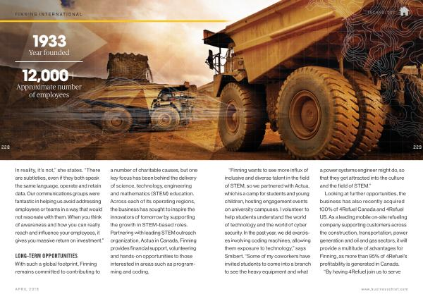 “ Finning wants to see more influx of inclusive and diverse talent in the field of STEM , so we partnered with Actua , which is a camp for students and young children , hosting engagement events on university campuses . I volunteer to help students understand the world of technology and the world of cyber security . In the past year , we did exercises involving coding machines , allowing them exposure to technology ,” says Smibert . “ Some of my coworkers have invited students to come into a branch to see the heavy equipment and what a power systems engineer might do , so that they get attracted into the culture and the field of STEM .”