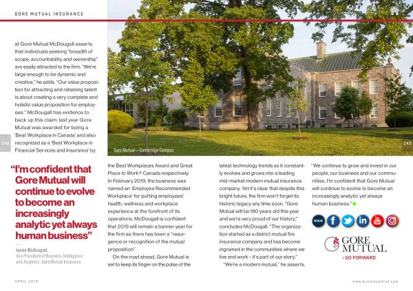 — Jamie McDougall , Vice President of Business Intelligence and Analytics , Gore Mutual Insurance the Best Workplaces Award and Great Place to Work ® Canada respectively . In February 2019 , the business was named an ‘ Employee Recommended Workplace ’ for putting employees ’ health , wellness and workplace experience at the forefront of its operations . McDougall is confident that 2019 will remain a banner year for the firm as there has been a “ resurgence or recognition of the mutual proposition ”.