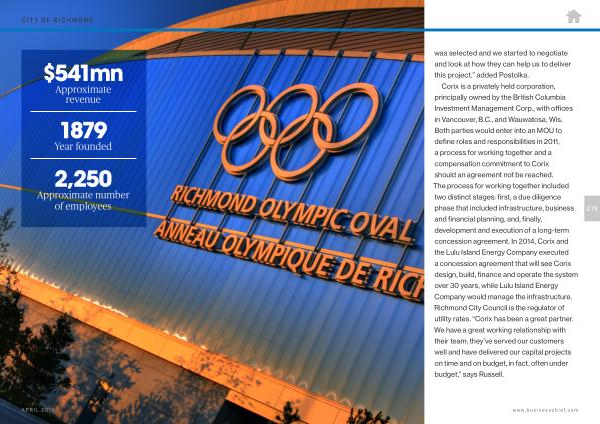 Corix is a privately held corporation , principally owned by the British Columbia Investment Management Corp ., with offices in Vancouver , B . C ., and Wauwatosa , Wis . Both parties would enter into an MOU to define roles and responsibilities in 2011 , a process for working together and a compensation commitment to Corix should an agreement not be reached . The process for working together included two distinct stages : first , a due diligence phase that included infrastructure , business and financial planning , and , finally , development and execution of a long-term concession agreement . In 2014 , Corix and the Lulu Island Energy Company executed a concession agreement that will see Corix design , build , finance and operate the system over 30 years , while Lulu Island Energy Company would manage the infrastructure . Richmond City Council is the regulator of utility rates . “ Corix has been a great partner . We have a great working relationship with their team ; they ’ ve served our customers well and have delivered our capital projects on time and on budget , in fact , often under budget ,” says Russell .