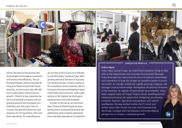 Fulya Oguz Fulya Oguz joined Cirque du Soleil Entertainment Group in May 2011 as the Operational and Costume Procurement Manager . Fulya leverages her more than 20 years of industry knowledge and experience to lead the charge on countless projects across the world . As a leader within the rapidly growing company , she manages critical relationships throughout all internal divisions of the business , in support of operational procurement . Fulya helps support many of Cirque ’ s largest shows , handling pivotal enterprise processes for negotiation , budgeting , purchasing , inventory logistics , operation management and vendor intelligence . Having worked within the IT , retail and online spaces like Oracle , Ice . com and Diamond . com , she brings a unique and vital business and technological perspective to Cirque ’ s continued growth .