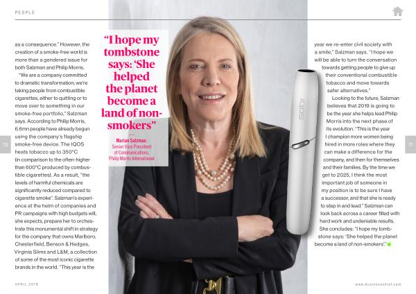 Looking to the future , Salzman believes that 2019 is going to be the year she helps lead Philip Morris into the next phase of its evolution . “ This is the year I champion more women being hired in more roles where they can make a difference for the company , and then for themselves and their families . By the time we get to 2025 , I think the most important job of someone in my position is to be sure I have a successor , and that she is ready to step in and lead .” Salzman can look back across a career filled with hard work and undeniable results . She concludes : “ I hope my tombstone says : ‘ She helped the planet become a land of non-smokers ’.”