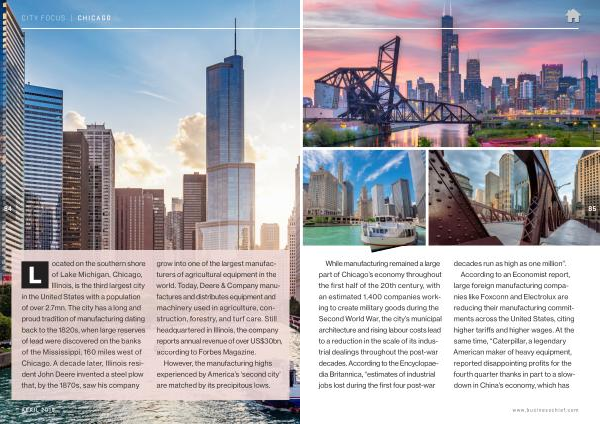 L ocated on the southern shore of Lake Michigan , Chicago , Illinois , is the third largest city in the United States with a population of over 2.7mn . The city has a long and proud tradition of manufacturing dating back to the 1820s , when large reserves of lead were discovered on the banks of the Mississippi , 160 miles west of Chicago . A decade later , Illinois resident John Deere invented a steel plow that , by the 1870s , saw his company grow into one of the largest manufacturers of agricultural equipment in the world . Today , Deere & Company manufactures and distributes equipment and machinery used in agriculture , construction , forestry , and turf care . Still headquartered in Illinois , the company reports annual revenue of over US $ 30bn , according to Forbes Magazine .