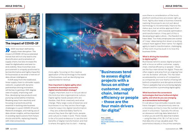 What is driving the transition to digital agility ? Businesses tend to assess digital projects with a focus on either customer , supply chain , internal efficiency or people – those are the four main drivers for digital . These are often organic and arise from an ongoing ‘ how can we do better ’ attitude . This has been accelerated by concerns of competition as companies are now fearful of being left behind competition and disruptive entrants . There is palpable fear around being digitally relevant and this is promoting digital agility .