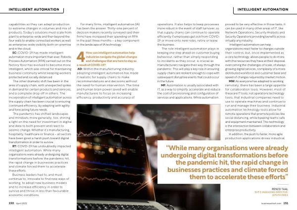 SC : COVID-19 has made intelligent automation more important than ever . Robotic Process Automation ( RPA ) carried out on the factory floor has evolved to become more intelligent , which was critical for maintaining business continuity whilst keeping workers protected and socially distanced .