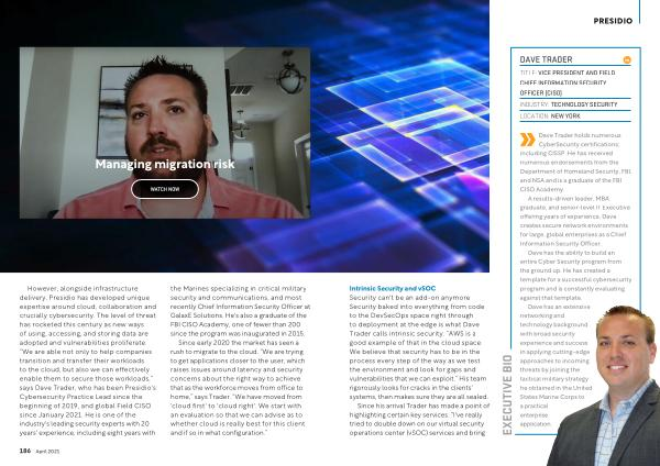 However , alongside infrastructure delivery , Presidio has developed unique expertise around cloud , collaboration and crucially cybersecurity . The level of threat has rocketed this century as new ways of using , accessing , and storing data are adopted and vulnerabilities proliferate . “ We are able not only to help companies transition and transfer their workloads to the cloud , but also we can effectively enable them to secure those workloads ,” says Dave Trader , who has been Presidio ' s Cybersecurity Practice Lead since the beginning of 2019 , and global Field CISO since January 2021 . He is one of the industry ' s leading security experts with 20 years ' experience , including eight years with the Marines specializing in critical military security and communications , and most recently Chief Information Security Officer at GalaxE Solutions . He ' s also a graduate of the FBI CISO Academy , one of fewer than 200 since the program was inaugurated in 2015 .