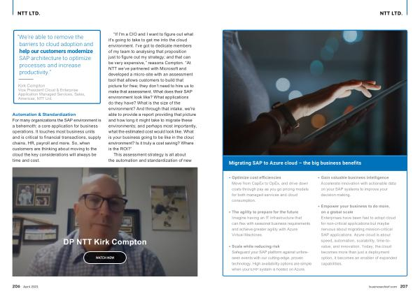 “ If I ' m a CIO and I want to figure out what it ' s going to take to get me into the cloud environment . I ' ve got to dedicate members of my team to analysing that proposition just to figure out my strategy ; and that can be very expensive ,” reasons Compton . “ At NTT we ’ ve partnered with Microsoft and developed a micro-site with an assessment tool that allows customers to build that picture for free ; they don ’ t need to hire us to make that assessment . What does their SAP environment look like ? What applications do they have ? What is the size of the environment ? And through that intake , we ' re able to provide a report providing that picture and how long it might take to migrate these environments ; and perhaps most importantly , what the estimated cost would look like . What is your business going to be like in the cloud environment ? Is it truly a cost saving ? Where is the ROI ?”