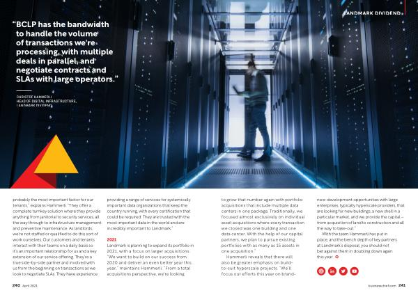 probably the most important factor for our tenants ,” explains Hammerli . “ They offer a complete turnkey solution where they provide anything from janitorial to security services , all the way through to infrastructure management and preventive maintenance . As landlords , we ' re not staffed or qualified to do this sort of work ourselves . Our customers and tenants interact with their teams on a daily basis so it ’ s an important relationship for us and a key extension of our service offering . They ’ re a true side-by-side partner and involved with us from the beginning on transactions as we look to negotiate SLAs . They have experience providing a range of services for systemically important data organizations that keep the country running , with every certification that could be required . They are trusted with the most important data in the world and are incredibly important to Landmark .”
