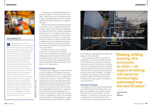 Technology will continue to support Newmont ’ s sustainability efforts as the business looks to develop onsite renewable power generation and energy efficiencies . It ’ s all part of a new ethos for the business spearheaded by CEO Tom Palmer . The work from home / work from anywhere paradigm prompted by the global pandemic has seen Newmont , like many other businesses , embrace proven methods of business interaction offering the flexibility that connects the boots on the ground to the boardroom . How the business is powered , both by people and fuel , is under constant review . “ Both new and existing mines are going to significantly reduce our emissions
