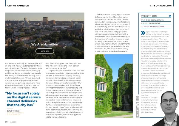 Officer at the City of Hamilton , a role which attracted him due to its unusual specifications . “ They were filling a Chief Digital Officer role and looking to do some creative things . Many cities don ’ t have CDOs yet and the opportunity to help shape the direction of digital transformation was what attracted me to the role . ” Despite the ‘ Digital ’ in his job title , Tehrani ’ s influence extends beyond that domain . “ It ’ s a bit of an odd portfolio in the sense of a CDO per se , where my focus isn ’ t solely on the digital service channel deliveries that the city has .”