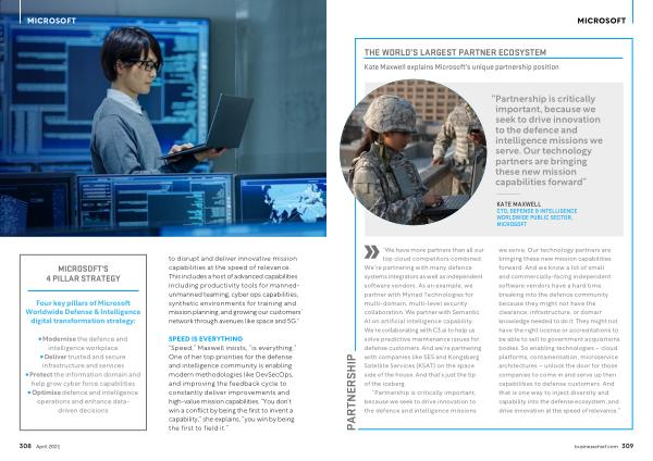 “ We have more partners than all our top cloud competitors combined . We ’ re partnering with many defence systems integrators as well as independent software vendors . As an example , we partner with Myriad Technologies for multi-domain , multi-level security collaboration . We partner with Semantic AI on artificial intelligence capability . We ’ re collaborating with C3 . ai to help us solve predictive maintenance issues for defense customers . And we ’ re partnering with companies like SES and Kongsberg Satellite Services ( KSAT ) on the space side of the house . And that ’ s just the tip of the iceberg .