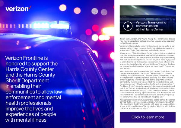 Verizon Frontline is honored to support the Harris County Center and the Harris County Sheriff Department in enabling their communities to allow law enforcement and mental health professionals improve the lives and experiences of people with mental illness .