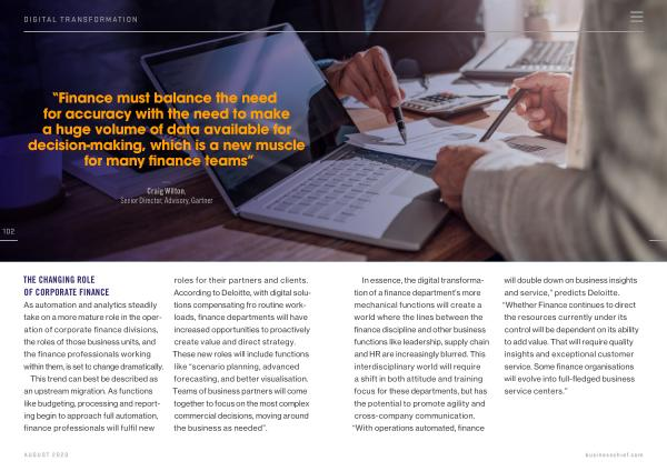This trend can best be described as an upstream migration . As functions like budgeting , processing and reporting begin to approach full automation , finance professionals will fulfil new roles for their partners and clients . According to Deloitte , with digital solutions compensating fro routine workloads , finance departments will have increased opportunities to proactively create value and direct strategy . These new roles will include functions like “ scenario planning , advanced forecasting , and better visualisation . Teams of business partners will come together to focus on the most complex commercial decisions , moving around the business as needed ”.
