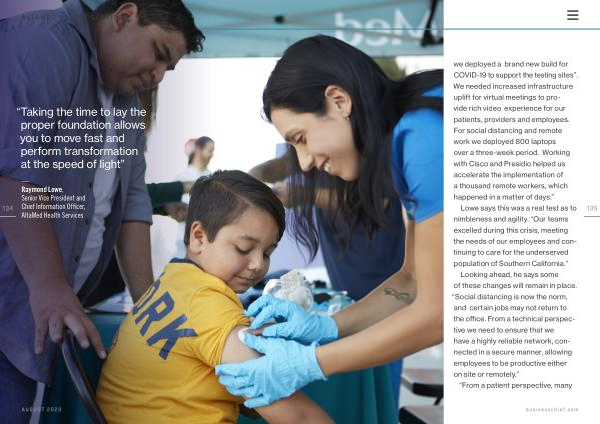 we deployed a brand new build for COVID-19 to support the testing sites ”. We needed increased infrastructure uplift for virtual meetings to provide rich video experience for our patients , providers and employees . For social distancing and remote work we deployed 800 laptops over a three-week period . Working with Cisco and Presidio helped us accelerate the implementation of a thousand remote workers , which happened in a matter of days .”