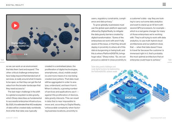 To grow globally , businesses must use the global open platform approach offered by Digital Realty to mitigate the data gravity barriers created by digital transformation . “ Some of the enterprises we work with aren ’ t fully aware of the issue , or that they should deploy in proximity to where all of this data is burgeoning or being built , and this is where PlatformDIGITAL brings huge value ,” Sharp notes . “ So , we can procure a cabinet in close proximity to a customer ’ s data – say they are looking to carry out some data analytics and want to stand up an AI farm with several GPU processors , for example – which is a real game changer for many of those enterprises we ’ re working with . They ’ re all trying to work with data analytics , to use multi-hybrid cloud architectures and our platform does that — when that data doesn ’ t have to travel far because the customer is immersed right in it , that ’ s probably the most optimal architecture that an enterprise could hope to achieve .” 159