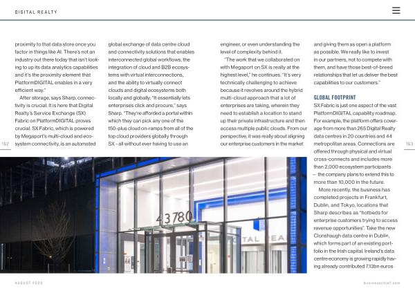 SX Fabric is just one aspect of the vast PlatformDIGITAL capability roadmap . For example , the platform offers coverage from more than 265 Digital Realty data centres in 20 countries and 44 metropolitan areas . Connections are offered through physical and virtual cross-connects and includes more than 2,000 ecosystem participants — the company plans to extend this to more than 10,000 in the future .