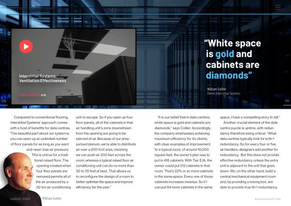 “ It is our belief that in data centres , white space is gold and cabinets are diamonds ,” says Collier . Accordingly , the company emphasises achieving maximum efficiency for its clients , with clear examples of improvement . “ In a typical room , of around 10,000 square feet , the owner ’ s plan was to put in 418 cabinets . With Tier E / A , the owner could put 512 cabinets in that room . That ’ s 22 % or so more cabinets in the same space . Every one of those cabinets increases revenue . So if I can put 94 more cabinets in the same space , I have a compelling story to tell .”