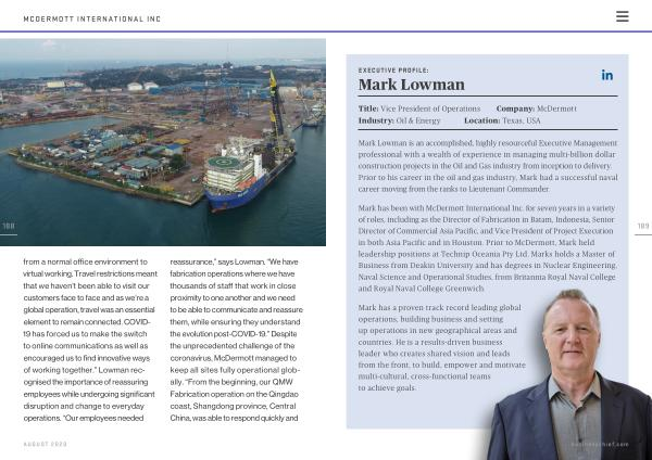 188 from a normal office environment to virtual working . Travel restrictions meant that we haven ’ t been able to visit our customers face to face and as we ’ re a global operation , travel was an essential element to remain connected . COVID- 19 has forced us to make the switch to online communications as well as encouraged us to find innovative ways of working together .” Lowman recognised the importance of reassuring employees while undergoing significant disruption and change to everyday operations . “ Our employees needed reassurance ,” says Lowman . “ We have fabrication operations where we have thousands of staff that work in close proximity to one another and we need to be able to communicate and reassure them , while ensuring they understand the evolution post-COVID-19 .” Despite the unprecedented challenge of the coronavirus , McDermott managed to keep all sites fully operational globally . “ From the beginning , our QMW Fabrication operation on the Qingdao coast , Shangdong province , Central China , was able to respond quickly and