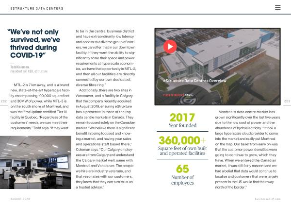 Additionally , there are two sites in Vancouver , and a facility in Calgary that the company recently acquired in August 2019 , ensuring eStruxture has a presence in three of the top data centre markets in Canada . They remain focused solely on the Canadian market . “ We believe there is significant benefit in being focused and knowing a market , and having your sales and operations staff based there ,” Coleman says . “ Our Calgary employees are from Calgary and understand the Calgary market well , same with Montreal and Vancouver . The people we hire are industry veterans , and that resonates with our customers , they know that they can turn to us as a trusted advisor .”