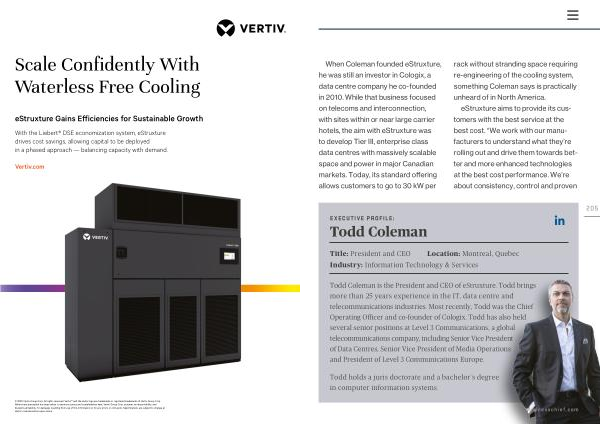 When Coleman founded eStruxture , he was still an investor in Cologix , a data centre company he co-founded in 2010 . While that business focused on telecoms and interconnection , with sites within or near large carrier hotels , the aim with eStruxture was to develop Tier III , enterprise class data centres with massively scalable space and power in major Canadian markets . Today , its standard offering allows customers to go to 30 kW per rack without stranding space requiring re-engineering of the cooling system , something Coleman says is practically unheard of in North America . eStruxture aims to provide its customers with the best service at the best cost . “ We work with our manufacturers to understand what they ’ re rolling out and drive them towards better and more enhanced technologies at the best cost performance . We ’ re about consistency , control and proven