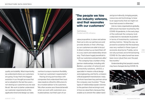 Like so many organisations globally , eStruxture has been touched by the COVID-19 pandemic . In the early days of the outbreak the company took a step back to reevaluate its position in terms of investments , customers and key metrics . “ Along the way , we proved to ourselves that the business was very resilient in these types of economic downturns . Frankly , we ’ ve not only survived , we ’ ve thrived during COVID-19 . Our sales funnel has never been more robust than over the past few months .”