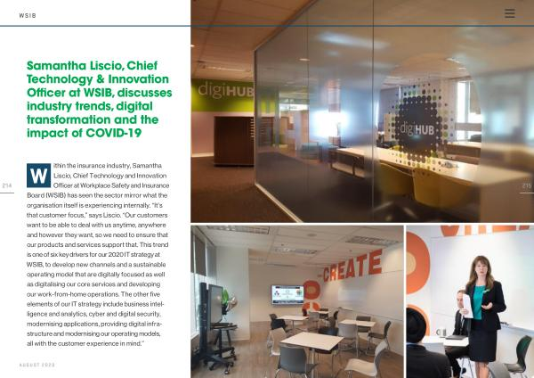 W ithin the insurance industry , Samantha Liscio , Chief Technology and Innovation Officer at Workplace Safety and Insurance Board ( WSIB ) has seen the sector mirror what the organisation itself is experiencing internally . “ It ’ s that customer focus ,” says Liscio . “ Our customers want to be able to deal with us anytime , anywhere and however they want , so we need to ensure that our products and services support that . This trend is one of six key drivers for our 2020 IT strategy at WSIB , to develop new channels and a sustainable operating model that are digitally focused as well as digitalising our core services and developing our work-from-home operations . The other five elements of our IT strategy include business intelligence and analytics , cyber and digital security , modernising applications , providing digital infrastructure and modernising our operating models , all with the customer experience in mind .”