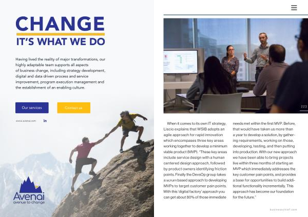 223 When it comes to its own IT strategy , Liscio explains that WSIB adopts an agile approach for rapid innovation which encompases three key areas working together to develop a minimum viable product ( MVP ). “ These key areas include service design with a human centered design approach , followed by product owners identifying friction points . Finally the DevsOp group takes a scrum based approach to developing MVPs to target customer pain points . With this ‘ digital factory ’ approach you can get about 80 % of those immediate needs met within the first MVP . Before , that would have taken us more than a year to develop a solution , by gathering requirements , working on those , developing , testing , and then putting into production . With our new approach we have been able to bring projects live within three months of starting an MVP which immediately addresses the key customer pain points , and provides a base for opportunities to build additional functionality incrementally . This approach has become our foundation for the future .” businesschief . com