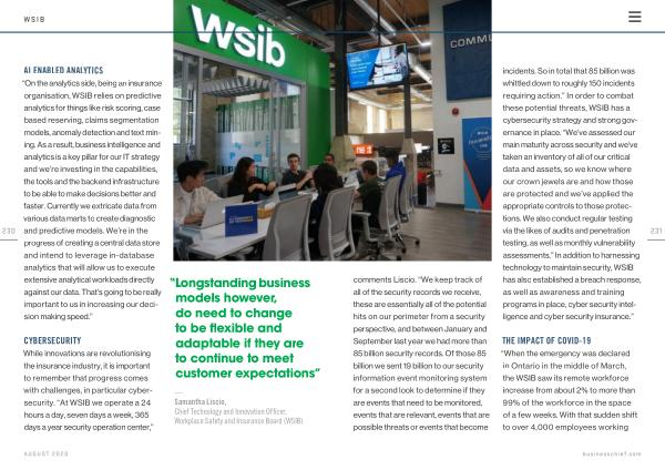 comments Liscio . “ We keep track of all of the security records we receive , these are essentially all of the potential hits on our perimeter from a security perspective , and between January and September last year we had more than 85 billion security records . Of those 85 billion we sent 19 billion to our security information event monitoring system for a second look to determine if they are events that need to be monitored , events that are relevant , events that are possible threats or events that become incidents . So in total that 85 billion was whittled down to roughly 150 incidents requiring action .” In order to combat these potential threats , WSIB has a cybersecurity strategy and strong governance in place . “ We ’ ve assessed our main maturity across security and we ’ ve taken an inventory of all of our critical data and assets , so we know where our crown jewels are and how those are protected and we ’ ve applied the appropriate controls to those protections . We also conduct regular testing via the likes of audits and penetration testing , as well as monthly vulnerability assessments .” In addition to harnessing technology to maintain security , WSIB has also established a breach response , as well as awareness and training programs in place , cyber security intelligence and cyber security insurance .”