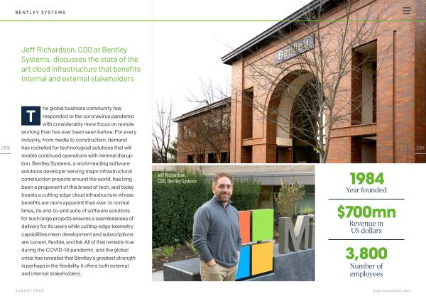 T he global business community has responded to the coronavirus pandemic with considerably more focus on remote working than has ever been seen before . For every industry , from media to construction , demand has rocketed for technological solutions that will enable continued operations with minimal disruption . Bentley Systems , a world-leading software solutions developer serving major infrastructural construction projects around the world , has long been a proponent of this breed of tech , and today boasts a cutting edge cloud infrastructure whose benefits are more apparent than ever . In normal times , its end-to-end suite of software solutions for such large projects ensures a seamlessness of delivery for its users while cutting-edge telemetry capabilities mean development and subscriptions are current , flexible , and fair . All of that remains true during the COVID-19 pandemic , and the global crisis has revealed that Bentley ’ s greatest strength is perhaps in the flexibility it offers both external and internal stakeholders .