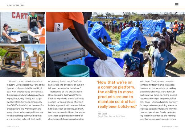 — Tim Covell , Supply Chain Director , World Vision with them . Then , once a donation is made , my team then is the execution arm , so our focus is on providing a high level of service to the donor . In particular , we focus on having a short response time to get the product off of their dock – which is typically a priority for corporations – providing a reverse logistics solution , integrating with the donor ’ s operations . Finally , maintaining that ministry focus and making sure that we are a pull operation is key .
