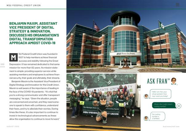 Benjamin Maxim is the Assistant Vice President of Digital Strategy and Innovation for the Credit Union . Maxim is well aware of the importance of leading in the face of the COVID-19 pandemic . “ It ’ s vital that you ’ re a strong communicator and offer transparent messaging ,” he says . “ Given the situation , people are concerned and uncertain , and they need someone to speak to them with confidence , understand their fears , and try to alleviate their worries . During times like these , it ’ s also important to continue to invest in technological advancements as these allow the organisation to continue to move forward .”