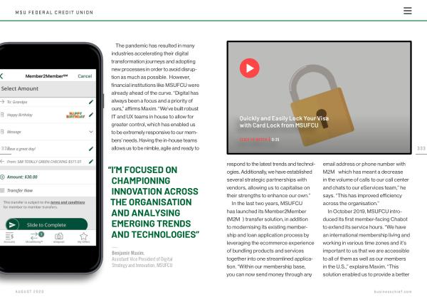 333 respond to the latest trends and technologies . Additionally , we have established several strategic partnerships with vendors , allowing us to capitalise on their strengths to enhance our own .” In the last two years , MSUFCU has launched its Member2Member℠ ( M2M℠ ) transfer solution , in addition to modernising its existing membership and loan application process by leveraging the ecommerce experience of bundling products and services together into one streamlined application . “ Within our membership base , you can now send money through any email address or phone number with M2M℠ which has meant a decrease in the volume of calls to our call center and chats to our eServices team ,” he says . “ This has improved efficiency across the organisation .”