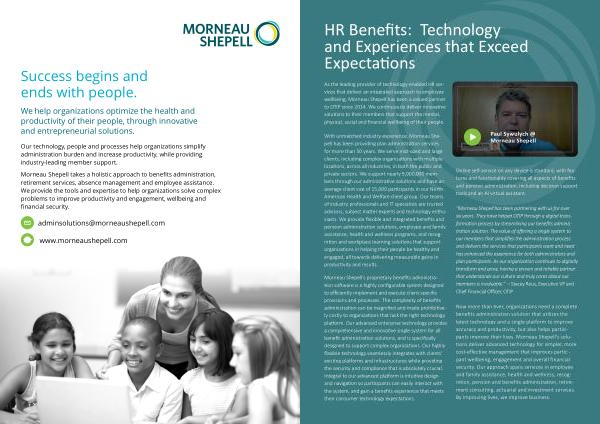 Now more than ever , organizations need a complete benefits administration solution that utilizes the latest technology and a single platform to improve accuracy and productivity , but also helps participants improve their lives . Morneau Shepell ’ s solutions deliver advanced technology for simpler , more cost-effective management that improves participant wellbeing , engagement and overall financial security . Our approach spans services in employee and family assistance , health and wellness , recognition , pension and benefits administration , retirement consulting , actuarial and investment services . By improving lives , we improve business .