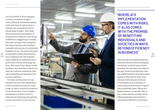 84 out across 60 % of all occupations could be automated , though it noted : “ Because automation applies at the task level , AI seems likely to change more occupations than it will eliminate outright .” And , while the aforementioned automation of around 50 % of tasks at a cost saving of $ 900bn is staggering to consider , “ this does not mean that companies will replace workers with machines overnight just because it is technically feasible to do so . The pace and extent of automation will be determined by how companies view the business case , weighing considerations such as the cost of these technology systems , their ease of use , labour market dynamics , the value that could be created , the customer experience , their own capabilities and regulatory and social acceptance .”