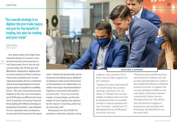 Any ‘ glass ceiling ’ that might have impeded Saphyre has been countenanced by the announcement in mid-September that it had struck a partnership with JP Morgan and BlackRock . Deployed to digitize their account opening workflow , produce improved scalability and remove manual processes , the two companies ’ choice to leverage Saphyre ’ s technology has given it a significant credibility boost . “ We were selected because Saphyre is the only one in this space , and [ JP Morgan and Blackrock ] were tired of pseudo-monopoly financial firms dealing with 1980s technology or faxing data information ,” says Stephen . “ It ’ s our reputation and consistency of execution that has led to this great news .” Indeed , the partnership can be viewed as simultaneously a validation of Saphyre ’ s value and an illustration of the importance of collaboration , no matter how large a financial institution might be , a conclusion that Gabino concurs with : “ If you try to be the master of many things , you ’ ll be the master of none . Saphyre has opted to be the master of one thing , which we do extremely well .”