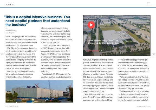 Previously , after joining Aligned in 2017 , Schaap struck a deal with Macquarie Infrastructure and Real Assets ( MIRA ) (“ not your traditional private equity ”) to recapitalise the business . “ This is a capital-intensive business . So , you have to have capital partners that are highly capable of understanding what the business looks like .”