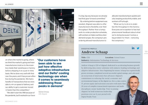 Andrew Schaap is CEO of Aligned , dedicated to accelerating business growth by delivering data center solutions with industry-leading technology and adaptive infrastructure . Since beginning his tenure , Schaap has exponentially grown revenues , completed several successful capital raisings , and cultivated an ecosystem of innovation that advances Aligned ’ s commitment to reducing the social , economic and environmental impact of the digital era . He is a data centre , IT , private equity and real estate executive with more than 20 years of complex transactional experience and multidisciplinary senior leadership . Prior to joining Aligned , he held numerous leadership positions over an 11-year period with Digital Realty Trust . businesschief . com