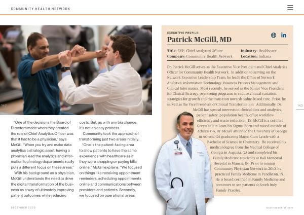 “ One of the decisions the Board of Directors made when they created the role of Chief Analytics Officer was that it had to be a physician ,” says McGill . “ When you try and make data analytics a strategic asset , having a physician lead the analytics and information technology departments really puts a different focus on these areas .”