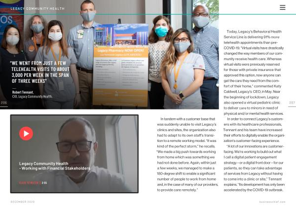 “ A lot of our innovations are customerfacing . We ’ re working to build out what I call a digital patient engagement strategy – or a digital front door – for our patients , so they can take advantage of services from Legacy without having to come into a clinic or site ,” Tennant explains . “ Its development has only been accelerated by the COVID-19 outbreak .