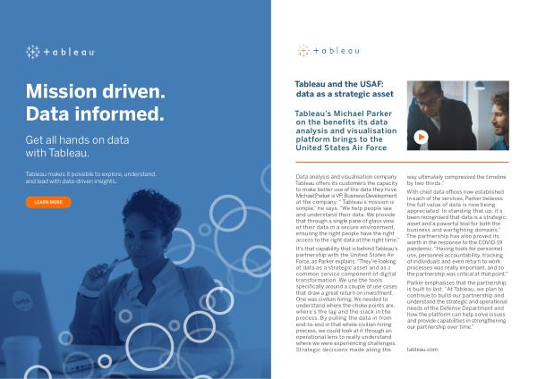 Tableau ’ s Michael Parker on the benefits its data analysis and visualisation platform brings to the United States Air Force Data analysis and visualisation company Tableau offers its customers the capacity to make better use of the data they have . Michael Parker is VP , Business Development at the company . “ Tableau ’ s mission is simple ,” he says . “ We help people see and understand their data . We provide that through a single pane of glass view of their data in a secure environment , ensuring the right people have the right access to the right data at the right time .”