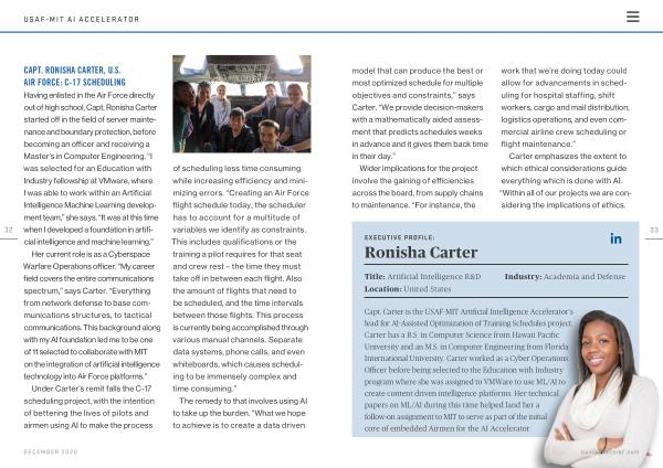 Capt . Carter is the USAF-MIT Artificial Intelligence Accelerator ’ s lead for AI-Assisted Optimization of Training Schedules project . Carter has a B . S . in Computer Science from Hawaii Pacific University and an M . S . in Computer Engineering from Florida International University . Carter worked as a Cyber Operations Officer before being selected to the Education with Industry program where she was assigned to VMWare to use ML / AI to create content driven intelligence platforms . Her technical papers on ML / AI during this time helped land her a follow-on assignment to MIT to serve as part of the initial core of embedded Airmen for the AI Accelerator . businesschief . com